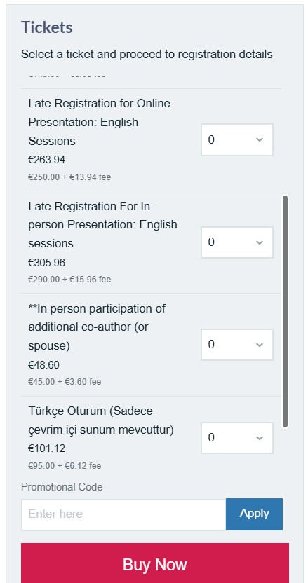 But for in-person presentations (if your co-authors also want to come to Alanya), your co-authors must register separately as **In-person participation of additional co-author (or spouse).