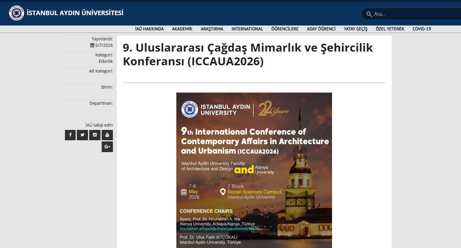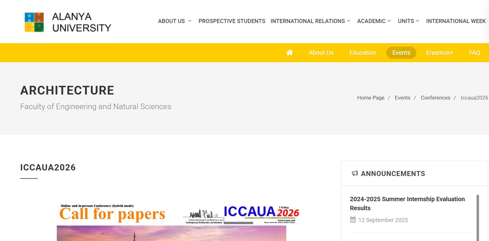 Organised by Alanya University and Istanbul Aydın University, ICCAUA2026 will feature high-quality keynote speeches, peer-reviewed presentations, and interdisciplinary networking opportunities—fostering global collaboration in the fields of architectural and urban studies.